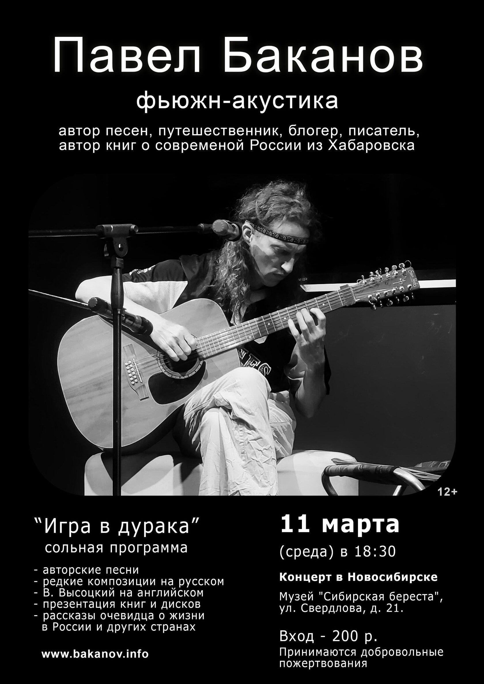 11 марта в 18:30 в музее "Сибирская береста" выступит Павел Баканов, автор-исполнитель, рок-музыкант, лауреат дальневосточных фестивалей, проехавший с концертами несколько стран, блогер, писатель из Хабаровска с авторской музыкальной программой "Игра в дурака". Владеет пятью техниками игры на 12-струнной гитаре. Прозвучат новые и старые авторские песни, редкие композиции на русском, В. Высоцкий на английском, рассказы очевидца жизни в России и в других странах.